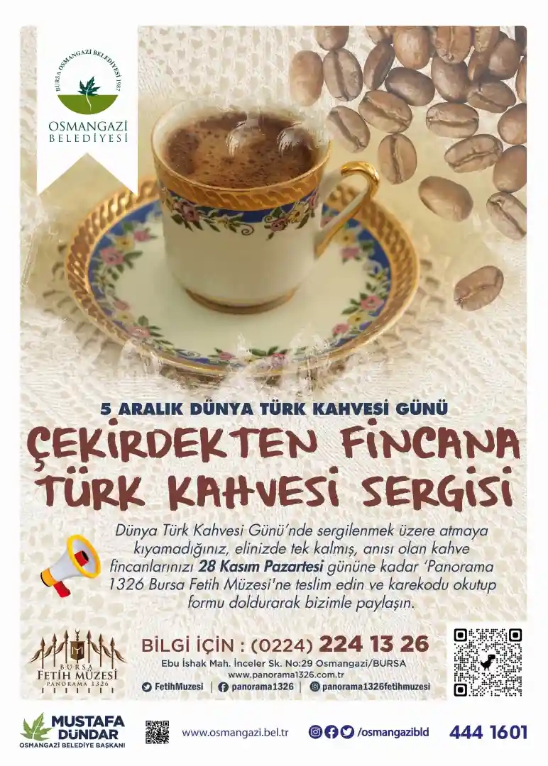 Osmangazi Belediyesinin, 5 Aralık Dünya Türk Kahvesi Günü çerçevesinde Panorama 1326 Bursa Fetih Müzesi’nde düzenleyeceği ‘Çekirdekten Fincana Türk Kahvesi Sergisi’ etkinliği ile kahve tutkunlarını buluşturacak. Eski, atmaya kıyılamayan ve 40 yıl hatırı olan kahve fincanları, hikayeleri ile birlikte vatandaşların beğenisine sunulacak.