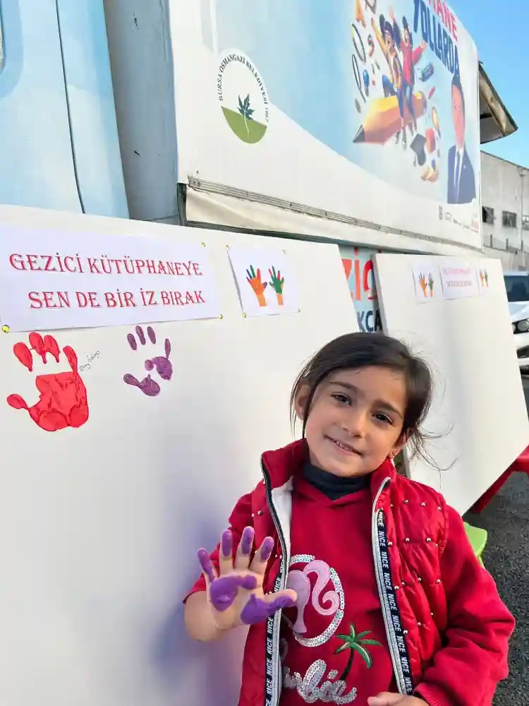 Osmangazi Belediyesi’nin merkeze uzak mahallerdeki çocukları kitap ile buluşturmak ve onlara okuma alışkanlığı kazandırmak amacıyla hayata geçirdiği Gezici Kütüphane’ye gelen küçük öğrenciler, rengarenk boyadıkları elleri ile hatıra panosu oluşturdu.
