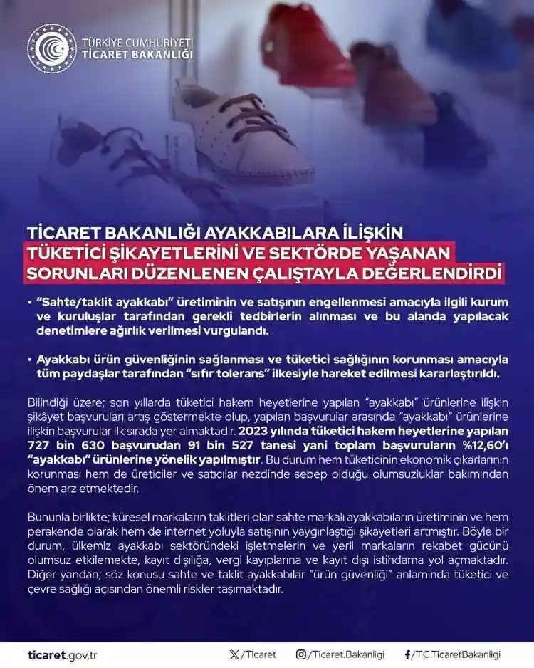 Ticaret Bakanlığı, ayakkabı ürün güvenliğinin sağlanması ve tüketici sağlığının korunması amacıyla tüm paydaşların "sıfır tolerans" ilkesiyle hareket etmesinin önem taşıdığını belirterek, sahte ve taklit ayakkabı üretim ve satışına karşı denetimlere ağırlık verileceğini belirtti.