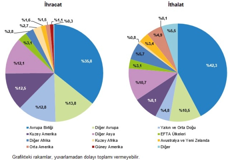 İthalatta ise İrlanda, yüzde 9,1 pay ve 4 milyar 396 milyon dolarla lider, ABD (yüzde 7,8, 3 milyar 787 milyon dolar) ve Almanya (yüzde 7,8, 3 milyar 758 milyon dolar) sıralamada yer aldı.