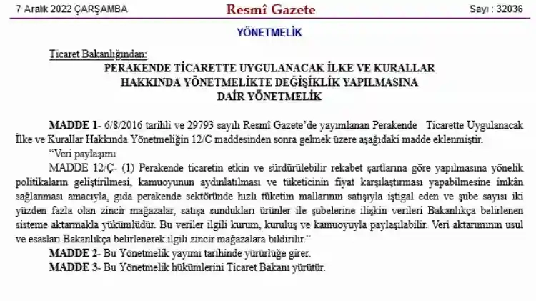 Buna göre, 200'den fazla şubesi olan zincir mağazalar, satışa sundukları ürünler ile şubelerine ilişkin verileri Ticaret Bakanlığı'nın belirlediği sisteme aktaracak. Bu veriler kurum, kuruluş ve kamuoyu ile paylaşılacak.