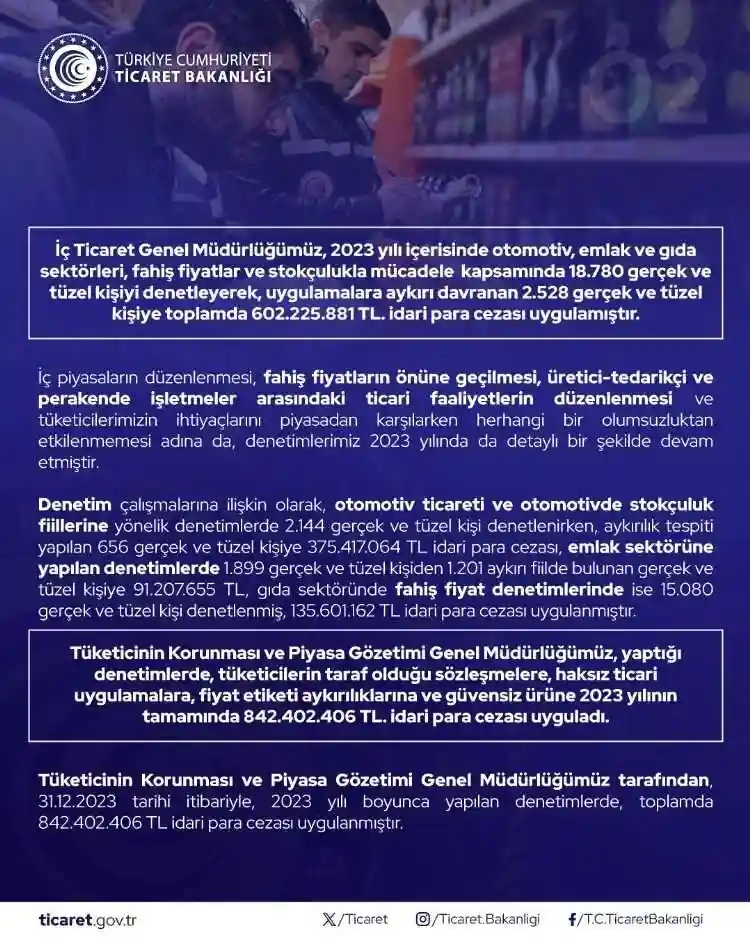 Ticaret Bakanlığı, otomotiv, emlak ve gıda sektörleri ile fahiş fiyat ve stokçuluk denetimleri kapsamında 18 bin 780 denetim gerçekleştirerek, 602 milyon 225 bin 881 lira idari para cezası uyguladı.