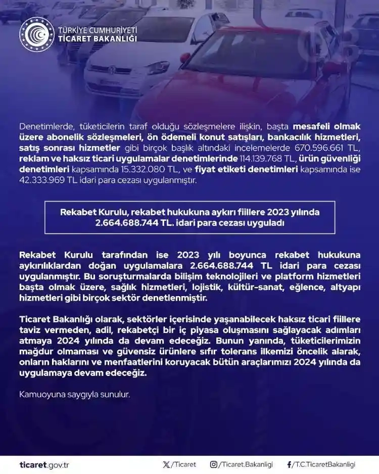Bakanlıktan, "Piyasalarımızda adil ticaret ortamının sağlanması, tüketicilerimizin hakları ve menfaatlerinin korunması amacıyla çalışmalarımız 2024 yılında da devam edecektir" açıklaması yapıldı.