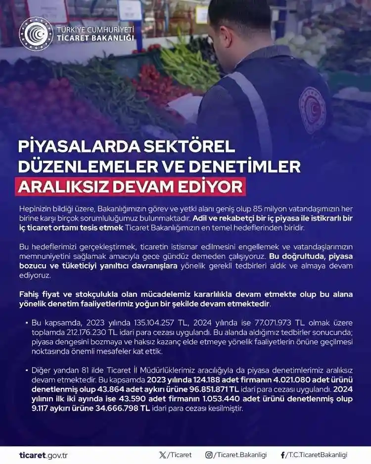 81 ilde Ticaret İl Müdürlükleri aracılığıyla piyasa denetimlerine de aralıksız devam eden Ticaret Bakanlığı, bu kapsamda, 2023 yılında 124 bin 188 firmanın 4 milyon 21 bin 80 adet ürününü denetleyerek 43 bin 864 aykırı ürüne 96 milyon 851 bin 871 TL idari para cezası uyguladı. 2024 yılının ilk iki ayında ise 43 bin 590 firmanın 1 milyon 53 bin 440 ürünü denetlendi, 9 bin 117 aykırı ürüne 34 milyon 666 bin 798 TL idari para cezası kesildi.
