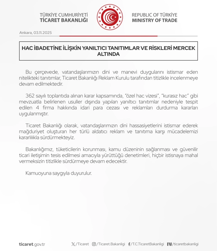 Kurulun değerlendirmesi sonucunda, “kurasız hac”, “özel hac vizesi” gibi ifadelerle vatandaşları yanıltıcı tanıtımlar yapan 4 firmaya idari para cezası verilmesine ve bu reklamlara durdurma kararı uygulanmasına hükmedildi.