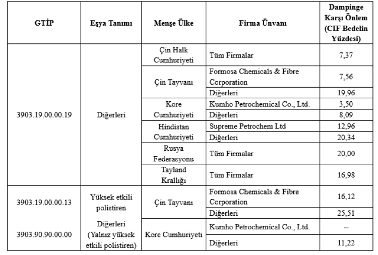 Bakanlık tarafından yürütülen damping soruşturması sonucunda, söz konusu ülkelerden ithal edilen GPPS (genel amaçlı polistiren) ve HIPS (yüksek etkili polistiren) ürünlerinin Türkiye’deki yerli üretim dalına maddi zarar verdiği tespit edildi.