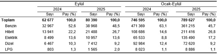 Ocak-Eylül döneminde trafiğe kaydı yapılan 789 bin 627 otomobilin yüzde 45,7’si benzinli, yüzde 26,8’i hibrit, yüzde 17,2’si elektrikli olarak öne çıktı.