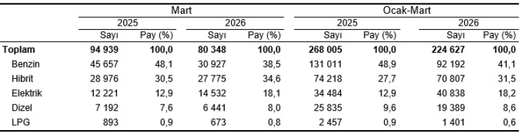 Yakıt türüne göre değerlendirildiğinde, yılın ilk üç ayında trafiğe kaydedilen otomobillerin yüzde 41,1’i benzinli, yüzde 31,5’i hibrit ve yüzde 18,2’si elektrikli oldu.