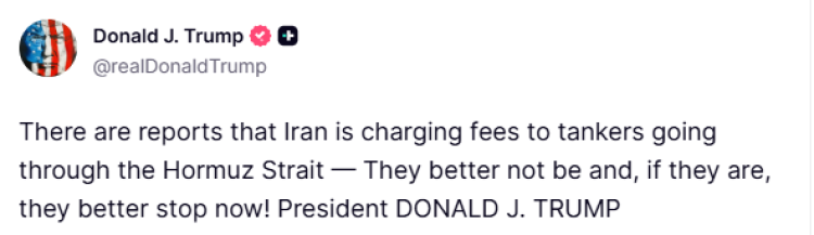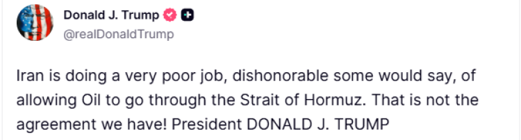 Trump, İran’la ilgili son paylaşımında tekrar Hürmüz Boğazı’ndaki duruma değinerek, "İran, petrolün Hürmüz Boğazı'ndan geçişine izin verme konusunda çok kötü bir iş çıkarıyor, bazıları bunun onursuzca olduğunu dahi söyleyebilir. Bizim yaptığımız anlaşma bu değil!" ifadelerini kullandı.