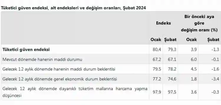 TÜİK ve Merkez Bankası işbirliği ile yürütülen tüketici eğilim anketi sonuçlarından hesaplanan tüketici güven endeksi, Ocak ayında 80,4 iken Şubat ayında %1,3 oranında azalarak 79,3 oldu.