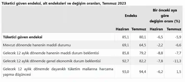 Türkiye İstatistik Kurumu ve Merkez Bankası işbirliği ile yürütülen tüketici eğilim anketi sonuçlarından hesaplanan Tüketici Güven Endeksi, Haziran ayında 85,1 iken Temmuz ayında yüzde 5,9 oranında azalarak 80,1 oldu.