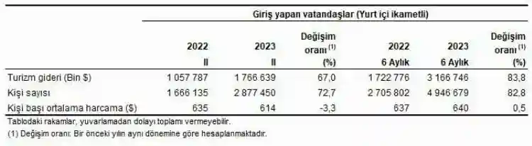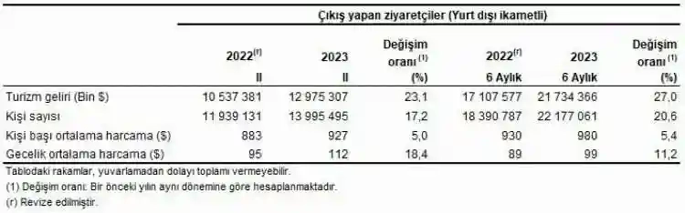 Türkiye'den çıkış yapan ziyaretçi sayısı 2023 yılı II. çeyreğinde bir önceki yılın aynı çeyreğine göre yüzde 17,2 artarak 13 milyon 995 bin 495 kişi oldu. Ziyaretçilerin yüzde 12'sini 1 milyon 676 bin 147 kişi ile yurt dışında ikamet eden vatandaşlar oluşturdu. Bu çeyrekte ülkemizden çıkış yapan ziyaretçilerin gecelik ortalama harcaması 112 dolar oldu. Yurt dışında ikamet eden vatandaşların gecelik ortalama harcaması ise 83 dolar oldu.