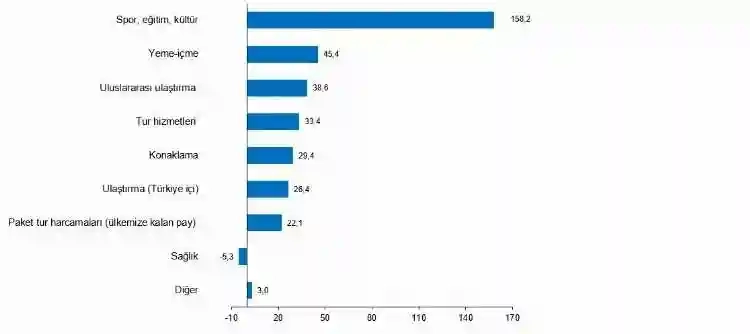 Bu çeyrekte geçen yılın aynı çeyreğine göre spor, eğitim, kültür harcaması yüzde 158,2, yeme-içme harcamaları yüzde 45,4, uluslararası ulaştırma harcamaları yüzde 38,6 arttı.