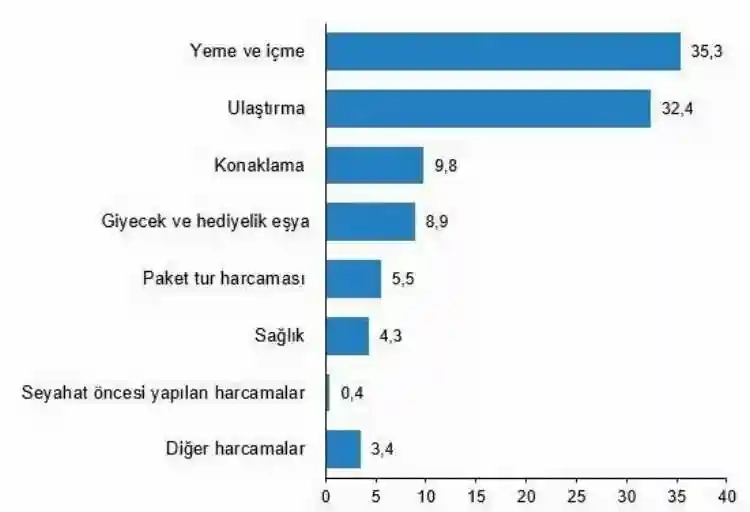 Bu çeyrekte harcama türlerinin toplam seyahat harcamaları içerisindeki dağılım oranları incelendiğinde en fazla paya yüzde 35,3 ile yeme ve içme harcamaları, yüzde 32,4 ile ulaştırma harcamaları ve yüzde 9,8 ile konaklama harcamaları sahip oldu. Bu harcama türlerinin geçen yılın aynı dönemine göre değişim oranları incelendiğinde ise yeme ve içme harcamalarında yüzde 116,9, ulaştırma harcamalarında yüzde 75,8 ve konaklama harcamalarında ise yüzde 61,6'lık artış görüldü.
