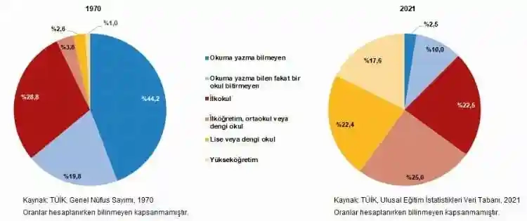 Türkiye'de okuma yazma bilmeyenlerin oranı 1935 yılında yüzde 80,8 iken bu oran yıllar içinde sürekli düşme eğilimi göstererek 2021 yılında yüzde 2,5'e düştü.