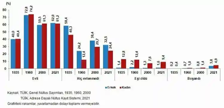 Ülkemizde yıllara ve cinsiyete göre medeni durumun dağılımı incelendiğinde, erkeklerde hiç evlenmeyenlerin oranının kadınlara göre daha yüksek olduğu, kadınlarda ise eşi ölenlerin ve boşananların oranının erkeklerden daha fazla olduğu görüldü.