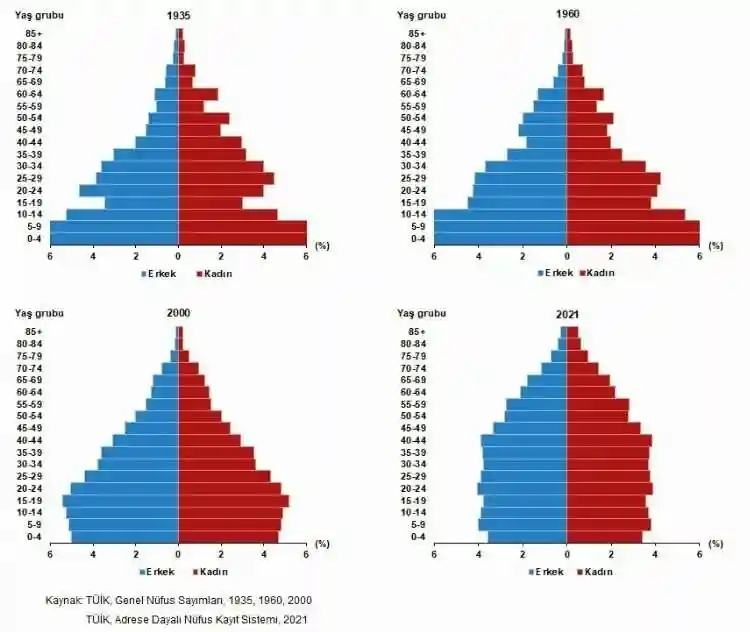 TÜİK verilerine göre Türkiye'nin 1935, 1960, 2000 ve 2021 yılı nüfus piramitleri incelendiğinde, sağlık alanında kaydedilen gelişmelere, yaşam standardının ve refah düzeyinin artmasına bağlı olarak doğurganlık ve ölümlülük hızlarının azalması ve doğuşta beklenen yaşam süresinin artması ile nüfusun yaş yapısının şekil değiştirdiği görüldü. Bu duruma bağlı olarak yaşlı nüfus artmış, ortanca yaş yükselmiş, çocuk ve gençlerin toplam nüfus içindeki oranı azalırken; Türkiye, oransal olarak yaşlı nüfus yapısına sahip ülkelere göre hala genç bir nüfus yapısına sahip olsa da, yaşlı nüfus sayısal olarak oldukça fazla.