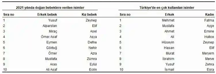 Ülkemizde 2021 yılında doğan bebeklere verilen isimler incelendiğinde, erkeklerde Yusuf, kızlarda ise Zeynep isminin ilk sırada yer aldığı görüldü. Türkiye nüfusu içinde cinsiyete göre en çok kullanılan isimler incelendiğinde ise erkeklerde Mehmet, kadınlarda da Fatma isminin ilk sırada olduğu gözlendi.