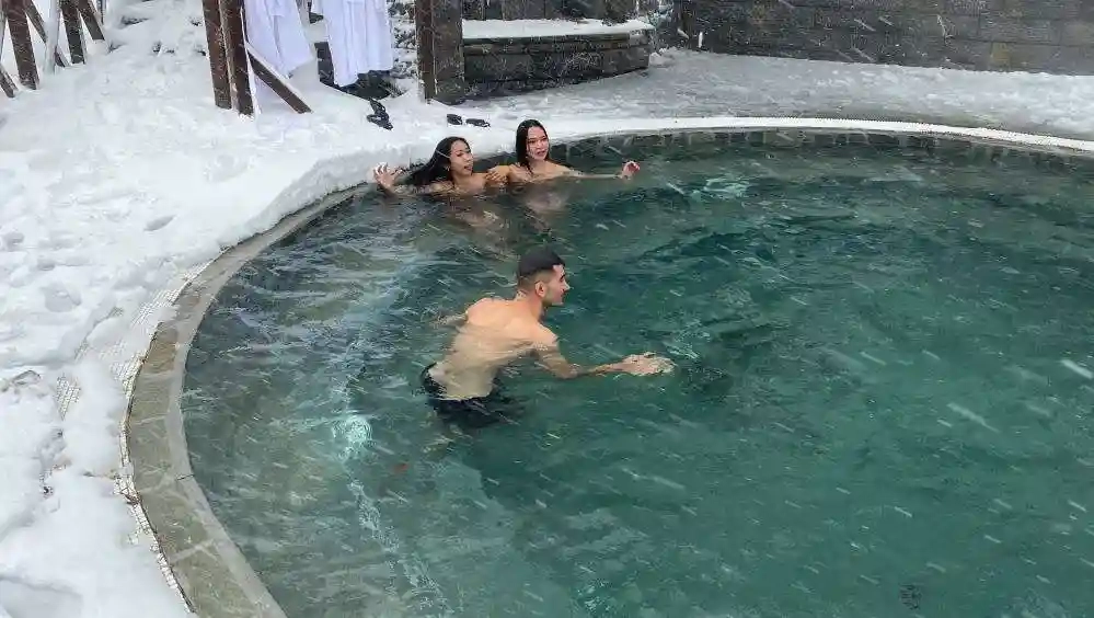İkinci oteller bölgesindeki bir oteldeki açık hava havuzları turistler tarafından ilgi görüyor. Etrafı karlarla çevrili olan sıcak havuza peştemal ve şortla giren yabancı turistler, önce karın, sonra da sıcak havuzun keyfini çıkartıyor. Havuzun sıcaklığı 40 dereceye ulaşırken, tatilciler eksi 5 derecede ter atıyor.