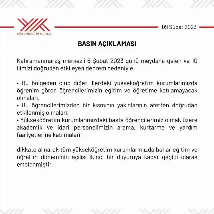 YÖK Başkanı Erol Özvar, tüm yükseköğretim kurumlarımızda bahar eğitim ve öğretim döneminin açılışının ikinci bir duyuruya kadar geçici olarak ertelenmesine yazılı basın açıklaması yaptı.