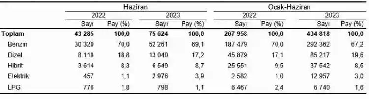 Türkiye İstatistik Kurumu (TÜİK)'nun Motorlu Kara Taşıtları İstatistiklerinde Haziran'da trafiğe kaydı yapılan 193 bin 688 adet taşıtın yüzde 46,1'ini motosiklet, yüzde 39,1'ini otomobil, yüzde 8,4'ünü kamyonet, yüzde 4,1'ini traktör, yüzde 1,6'sını kamyon, yüzde 0,3'ünü minibüs, yüzde 0,3'ünü otobüs ve yüzde 0,1'ini özel amaçlı taşıtlar oluşturdu.