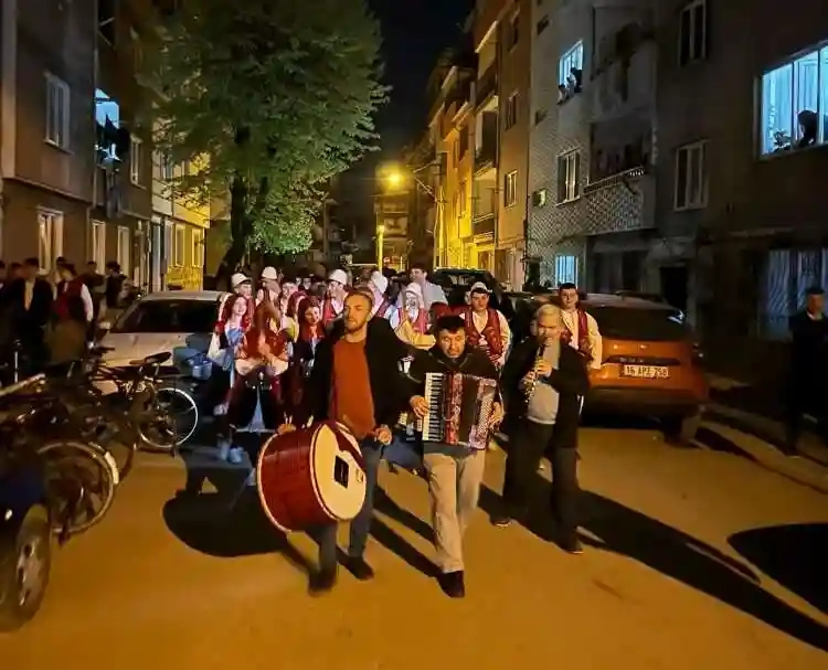 Dernek binasında toplanan folklor grubu, dernek üyeleriyle birlikte müzik eşliğinde Süleymaniye Mahallesi’ni dolaşarak vatandaşları sahura kaldırdı. Rumeli ekibinin sesini duyarak camlara çıkan vatandaşlar ise, oyunlara alkış ile tempo tuttu.