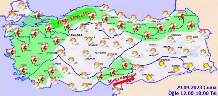 Meteoroloji Genel Müdürlüğü tarafından yapılan son değerlendirmelere göre: Ülkemizin kuzey, iç ve batı kesimlerinin yer yer çok bulutlu, Marmara'nın güney ve doğusu, Ege, Doğu Akdeniz'in iç kesimleri, Batı Karadeniz, Orta ve Doğu Karadeniz'in iç kesimleri, Burdur, Eskişehir, Erzincan, Kars ve Ardahan çevreleri ile Ankara'nın batı, Antalya'nın iç kesimlerinin yerel sağanak ve gök gürültülü sağanak yağışlı, diğer yerlerin parçalı ve az bulutlu geçeceği tahmin ediliyor. Yağışların; Balıkesir ve Bursa’nın kuzey kesimleri ile İstanbul'un Anadolu Yakası'nın doğusu, Yalova, Kocaeli, Sakarya, Düzce ve Zonguldak ile Batı Karadeniz’in iç kesimlerinde yer yer kuvvetli olması bekleniyor.