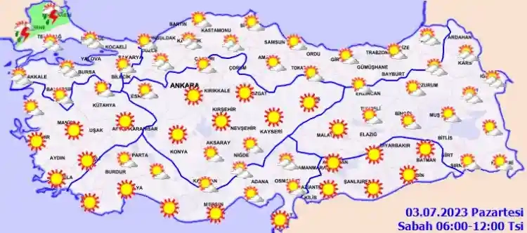 Az bulutlu ve açık, iç kesimlerinin yer yer parçalı bulutlu, Burdur çevreleri ile Doğu Akdeniz'in Toroslar kesiminin öğle saatlerinde kısa süreli ve yerel olmak üzere sağanak ve gök gürültülü sağanak yağışlı geçeceği tahmin ediliyor.