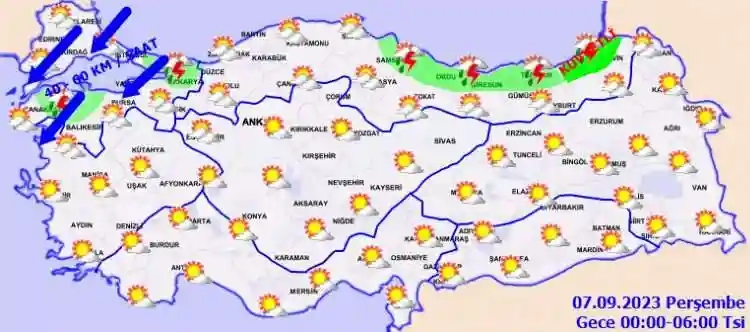 Meteoroloji Genel Müdürlüğü tarafından yapılan son değerlendirmelere göre: Ülkemizin kuzey ve batı kesimlerinin parçalı, yer yer çok bulutlu, Marmara, Kuzey ve İç Ege, Orta ve Doğu Karadeniz kıyıları, Eskişehir, Bolu, Düzce, Sinop ve Artvin çevreleri ile Ankara’nın kuzeybatı kesimlerinin yerel olmak üzere sağanak ve gök gürültülü sağanak yağışlı, diğer yerlerin az bulutlu ve açık geçeceği tahmin ediliyor. Yağışların, Uşak, Kütahya, Rize ve Artvin çevreleri ile Manisa’nın doğusunda yer yer kuvvetli olması bekleniyor.