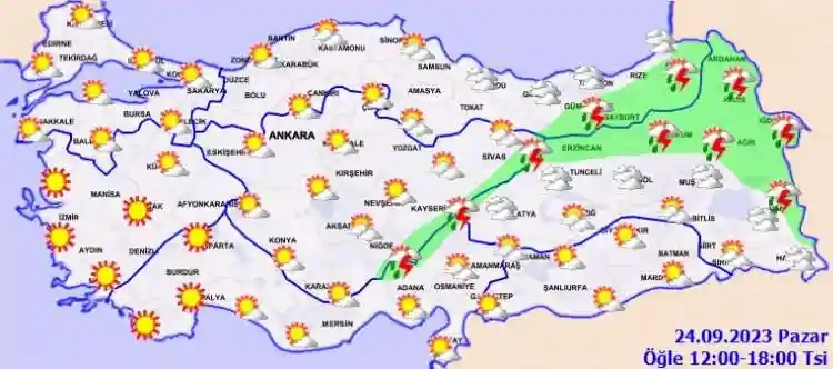 Meteoroloji Genel Müdürlüğü tarafından yapılan son değerlendirmelere göre: Ülkemizin kuzeydoğu kesimlerinin parçalı, yer yer çok bulutlu, Doğu Karadeniz'in iç kesimleri, Doğu Anadolu'nun kuzeydoğusu, Doğu Akdeniz'in Toroslar mevkii, Van çevreleri ile Malatya'nın kuzeyi, Kayseri ve Sivas'ın doğu kesimlerinin kısa süreli yerel sağanak ve gök gürültülü sağanak yağışlı, diğer yerlerin az bulutlu ve açık geçeceği tahmin ediliyor.