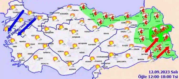 KUVVETLİ RÜZGAR UYARISI: Rüzgarın; Marmara ve Kuzey Ege kıyıları ile Doğu Anadolu'nun güneydoğusunda kuvvetli olarak (40-60 km/saat) esmesi beklendiğinden yaşanabilecek olumsuzluklara karşı dikkatli ve tedbirli olunmalıdır.