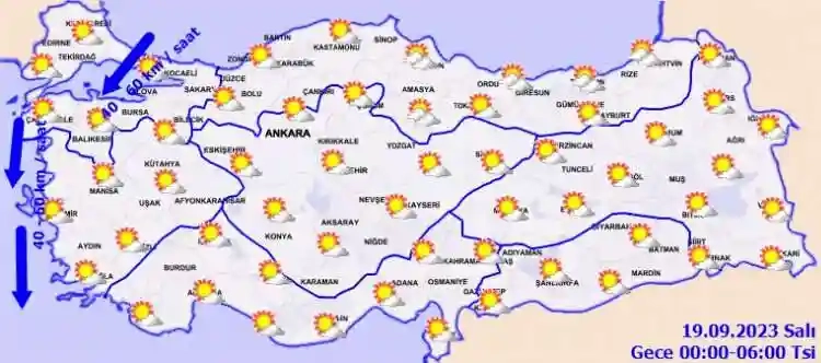 RÜZGAR: Genellikle kuzey, Doğu Akdeniz kıyıları ile yurdun güneydoğusunda güney yönlerden hafif, ara sıra orta kuvvette, Marmara ile Ege kıyılarında kuzey ve kuzeydoğu yönlerden kuvvetli (30-60 km/saat) olarak esmesi bekleniyor.