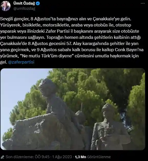 Zafer Partisi Genel Başkanı Ümit Özdağ sosyal medyadan yaptığı paylaşımda tüm gençleri 8 Ağustos’ta Çanakkale ruhunu bir nebze de olsa yaşayabilmek için Çanakkale’ye davet ediyor