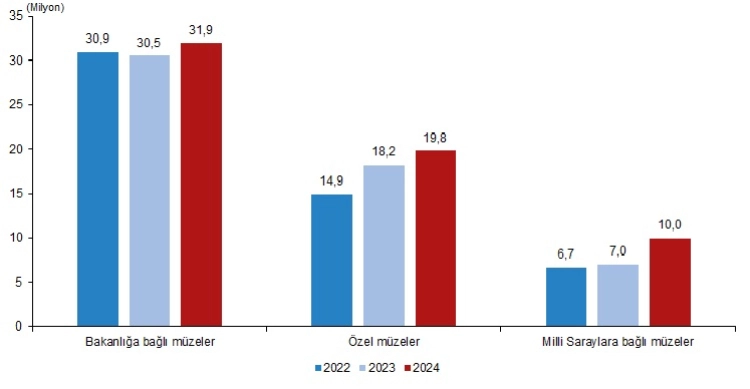TÜİK’in 2024 Kültürel Miras İstatistikleri’ne göre, Türkiye’de müze sayısı yüzde 5 artarak 636’ya, müze ve ören yeri ziyaretçi sayısı yüzde 10,6 artarak 61,7 milyona ulaştı. Taşınmaz kültür varlıkları, milli parklar ve tabiat parklarında da artış kaydedildi.