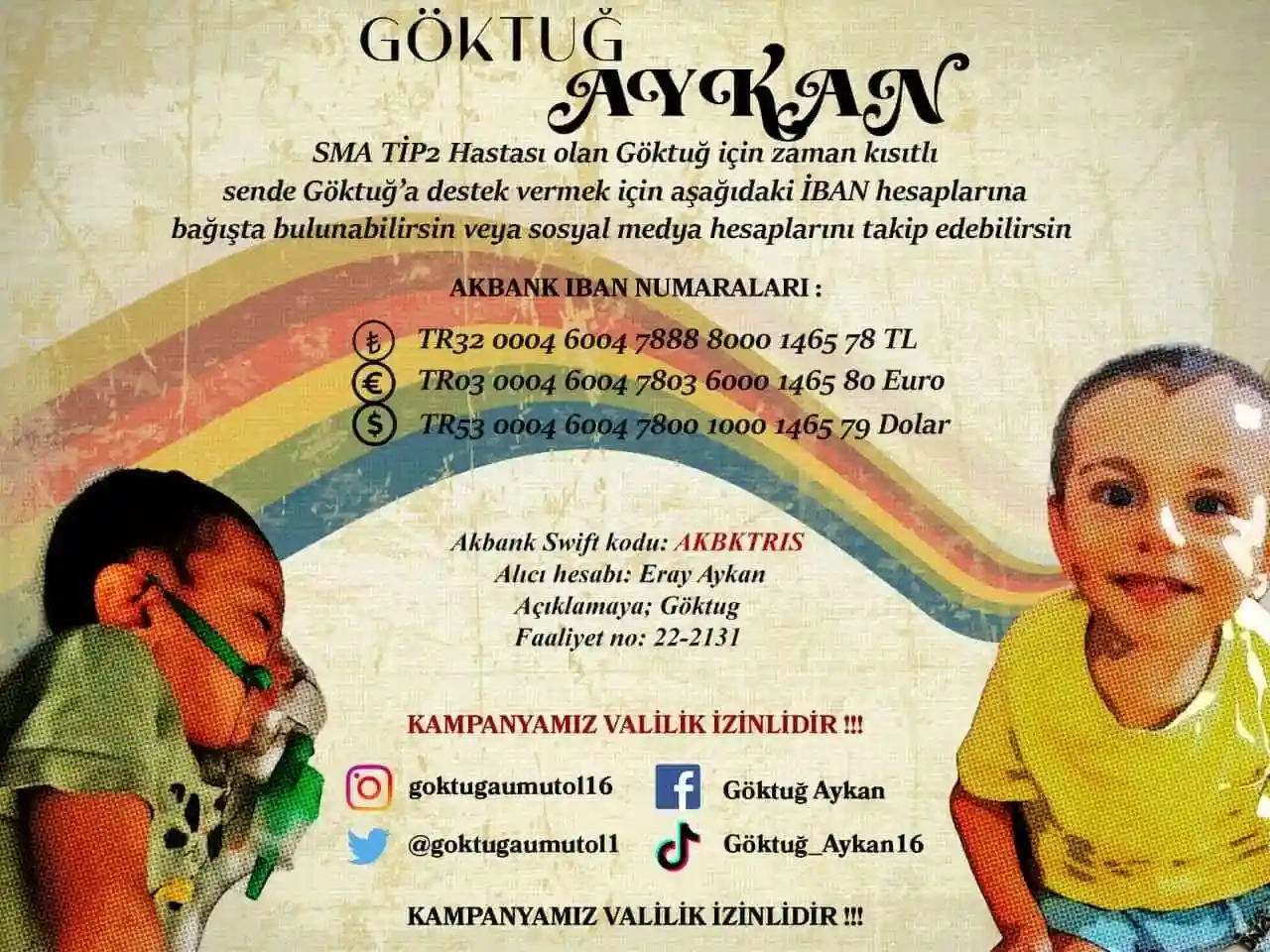 Spinal Muskuler Atrofi (SMA) Tip 2 hastası 3 yaşındaki Göktuğ Aykan’ın gerekli sağlığına kavuşabilmesi için için yardım bekliyor. Baba Eray Aykan, oğlunun tedavisi için valiliğe başvurup yardım kampanyası başlattı. Gerekli olan 1,8 milyon doların toplanması halinde oğlunun hayata tutunabilmesi için gerekli ilacı temin edebileceklerini dile getiren Aykan, yardımseverlerin desteğini istedi. Minik Göktuğ'nun hayata tutunabilmesi için düzenlenen kampanyaya katılmak isteyen yardımseverler, baba Eray Aykan'a 0 535 810 95 07 nolu telefondan ulaşabilir.