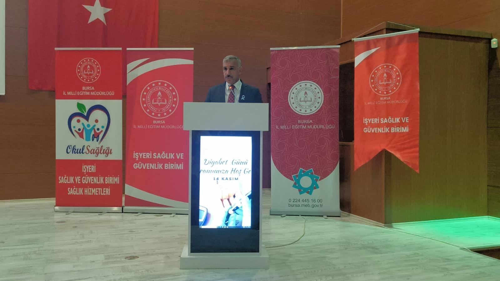 Bursa’nın Osmangazi ilçesinde yer alan Şehit Hakan Ünver Mesleki ve Teknik Anadolu Lisesi tarafından, 14 Kasım Dünya Diyabet Günü kapsamında toplumda farkındalık oluşturmak, diyabetin önemine dikkat çekmek ve sağlıklı bir geleceğe katkıda bulunmak amacıyla il programı düzenlendi. 20 Kasım 2025 Perşembe günü saat 10.30’da toplantı Salonunda gerçekleştirilen programa; İl Millî Eğitim Müdür Yardımcısı Yunus Bulut, Osmangazi İlçe Millî Eğitim Müdürü Metin Sezer ve Halk Sağlığı Hizmetleri Başkan Yardımcısı Dr. Tülay Köse ile birlikte öğretmenler, öğrenciler ve sağlık çalışanları katıldı.