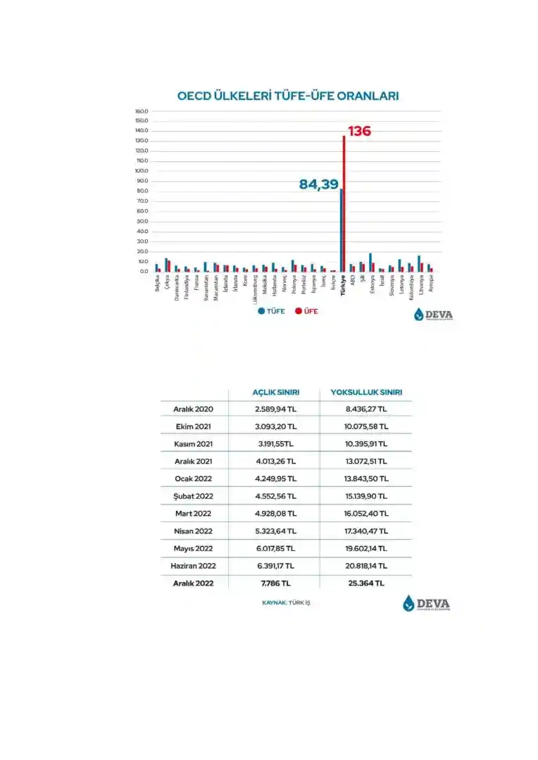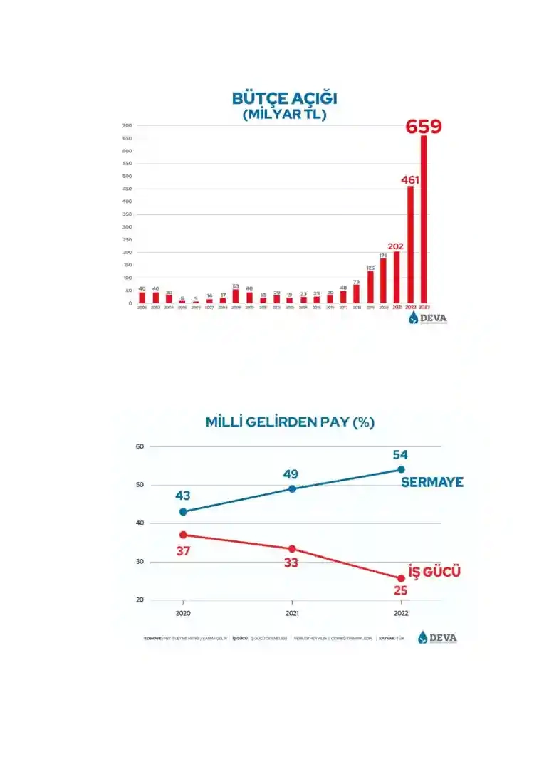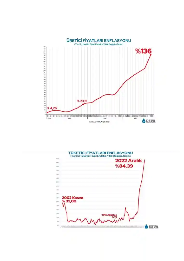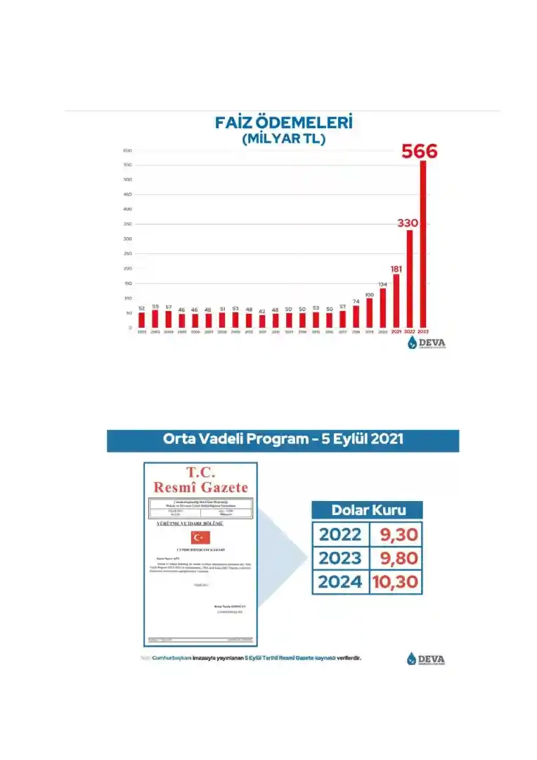 - Deva Partisi siyaset yapma üslubuna da bir seviye getirmek için yola çıktı. Artık bu ülkede bağırmadan, hakaret etmeden de siyaset yapılabileceğini ortaya koyduk. “Sesimizi yükseltmek yerine, sözümüzü yükseltmeyi tercih ettik.” Değerli Basın Mensupları, Bugün ülkemiz çok zor bir süreçten geçiyor, *Ülkemizde kutuplaşma zirve yaptı, *Kuvvetler ayrılığı ortadan kalktı. Bu durum yargı bağımsızlığına ciddi zarar verdi ve Adalet sistemi güven vermiyor, *Yürütme erkinin başındakiler, mahkeme kararlarına uymayacaklarını ifade edebiliyor ve bunun örneklerini de ortaya koyuyor. İdari yargının verdiği kararlar hükümet mensuplarınca uygulanmıyor, *Türkiye’nin ekonomisi son 20 senenin en kötü dönemini yaşıyor, *Hızla fakirleşiyoruz, *Hane halkının giderleri 3-4 kat artarken, gelirleri aynı oranda artmıyor. Bu da satın alma gücünü düşürüyor, *5 Eylül 2021’de Orta Vadeli Planı bizzat Sayın Cumhurbaşkanı açıkladı ve döviz kurunu 2022 için 9.30 TL 2023 için 9.80 TL 2024 için 10.30 TL olarak ilan etti. Oysa bugün dolar 18.77 TL. Sadece bu tablo bile mevcut yönetimin ülke şartlarını değerlendirmedeki öngörüsüzlüğünü ortaya koyan ibret belgesidir. *Son 20 yılın mukayeseli faiz ödemeleri tablosu, bütçe açığı tablosu, enflasyon oranlarını gösteren tablolara baktığımızda içinde bulunduğumuz acıklı durum çok net ortaya çıkıyor.
