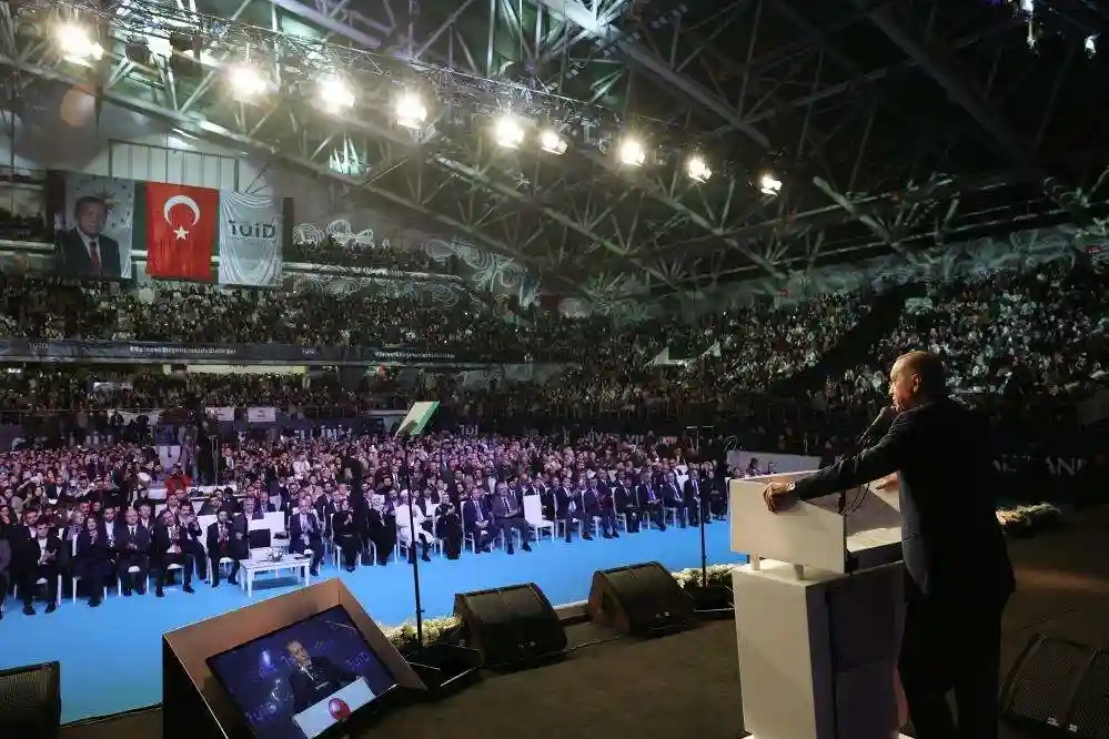 Erdoğan, “Ne dediler, ‘helalleşme’. Tek parti zihniyetinin değişmediğini ve asla değişmeyeceğini hep birlikte yeniden görmüş olduk. Meclise sunduğumuz anayasa değişikliği teklifi ile, tüm bu habis niyetlerin önüne set vurmayı hedefliyoruz. Böylece başörtüsüne anayasal güvence kazandırırken sapkın akımların hedefi haline gelen aile müessesesini de bu anayasa metnine koyacağız. Temennimiz teklifimizin en geniş mutabakatla TBMM'den geçmesidir. Şayet gereken çoğunluk sağlanamaz, yol kazası yaşanırsa, son sözü yine milletimiz söyleyecektir. İnşallah referanduma gerek kalmadan, Meclis'imizde bu meseleyi kalıcı çözüme kavuşturacağımıza inanıyorum. Rabbim bizlere 25 yıl boyunca milletimize hizmet etmeyi nasip etti. Gençlik yıllarımda spikerliğini yaptığım Sultanahmet Meydanı'nda üstat konuşuyor. Üstat konuşurken Ayasofya'yı gösteriyor, ‘Ayasofya açılacak, Ayasofya açılacak.’ Ayasofya açıldı mı, açıldı. Bize de nasip oldu mu, nasip oldu. Allah’ımıza hamd olsun. Rabb’im bizlere Türkiye’nin şefkat ve merhamet sancağını dünyanı dört bir yanına ulaştırmayı nasip etti. Rabb’ime sonsuz hamdü senalar olsun, 86 yıl aradan sonra Ayasofya'nın zincirlerini kırarak mührünü sökmeyi nasip etti. Hamdolsun dualar niyazlar gözyaşlarıyla asli kimliğine yeniden kavuşturduk. Son 20 yıllık başarılarımızın rehberliğinde şimdi çok daha büyük hedeflere kilitlendiğimiz zorlu bir yola revan oluyoruz. Bu yolculuğun menzili Türkiye Yüzyılı'na ulaşmaktır. 2023 seçimleri büyük önem taşıyor. Türkiye bu seçimlerde sadece gelecek 5 yılının değil, gelecek 25 yılının 50 yılının hatta 100 yılının nasıl olacağına karar verecektir. Türkiye, ya güçlü, vizyoner liderlik altında geleceğe yürüyecek ya da kavganın entrikanın gırla gittiği arkaik yapının esiri olacaktır. Özellikle gençlerimizden, sandığa gittiklerinde oylarını kullanmadan önce sadece iki siyasi ittifak arasında değil, iki Türkiye arasında da tercih yaptıklarını unutmamalarını istirham ediyorum” dedi.