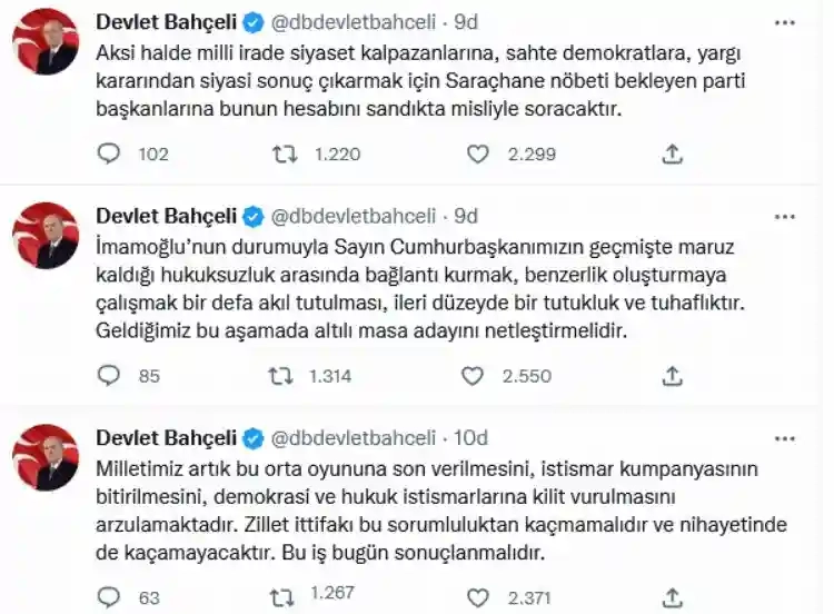 MHP Genel Başkanı Devlet Bahçeli, sosyal medyadan İstanbul Büyükşehir Belediye Başkanı Ekrem İmamoğlu davasındaki kararla ilgili açıklama yaptı.