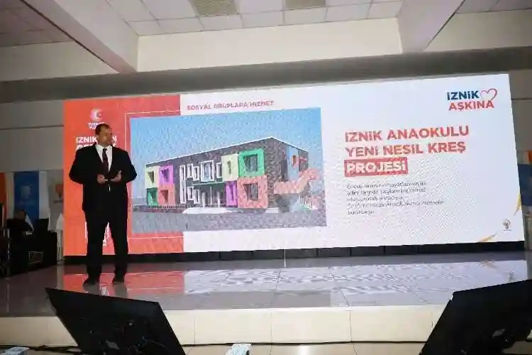 İznik’te sosyal konut projeleri, eğitim, spor, sosyal faaliyetler, fiziki yatırımlar, gençlik, kadın, tarım, çocuklar, kültür ve sanat gibi birçok konuda yapılması planlanan projeler ekran önünde İzniklilerle paylaşıldı. Başkan Usta’nın sunumu vatandaşlardan uzun süre alkış aldı.