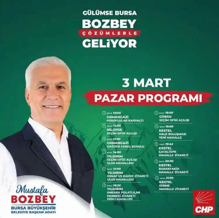 31 Mart Yerel seçimlerine doğru geri sayım sürerken seçim çalışmalarına hız veren CHP Bursa Büyükşehir Belediye Başkan Adayı Mustafa Bozbey’in yoğun temposu devam ediyor. Her gün Bursa’nın farklı ilçe ve mahallelerine giderek vatandaşlarla bir araya gelen Belediye Başkan Adayı, bugün (03 Mart 20204) 5 ilçeyi daha ziyaret edecek.