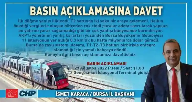 CHP Bursa İl Başkanlığı, geçtiğimiz günlerde kullanıma açılan T2 tramvay hattı ile alakalı basın açıklamasında bulunacak.