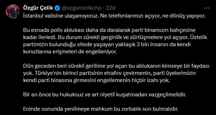 CHP İstanbul İl Başkanlığı görevinden mahkeme kararıyla uzaklaştırılan Özgür Çelik, sosyal medya hesabından yaptığı paylaşımda, CHP İstanbul İl Başkanlığı binasının çevresindeki polis ablukasının yoğunlaştığını ve binanın bahçesine kadar ilerlediğini duyurdu.