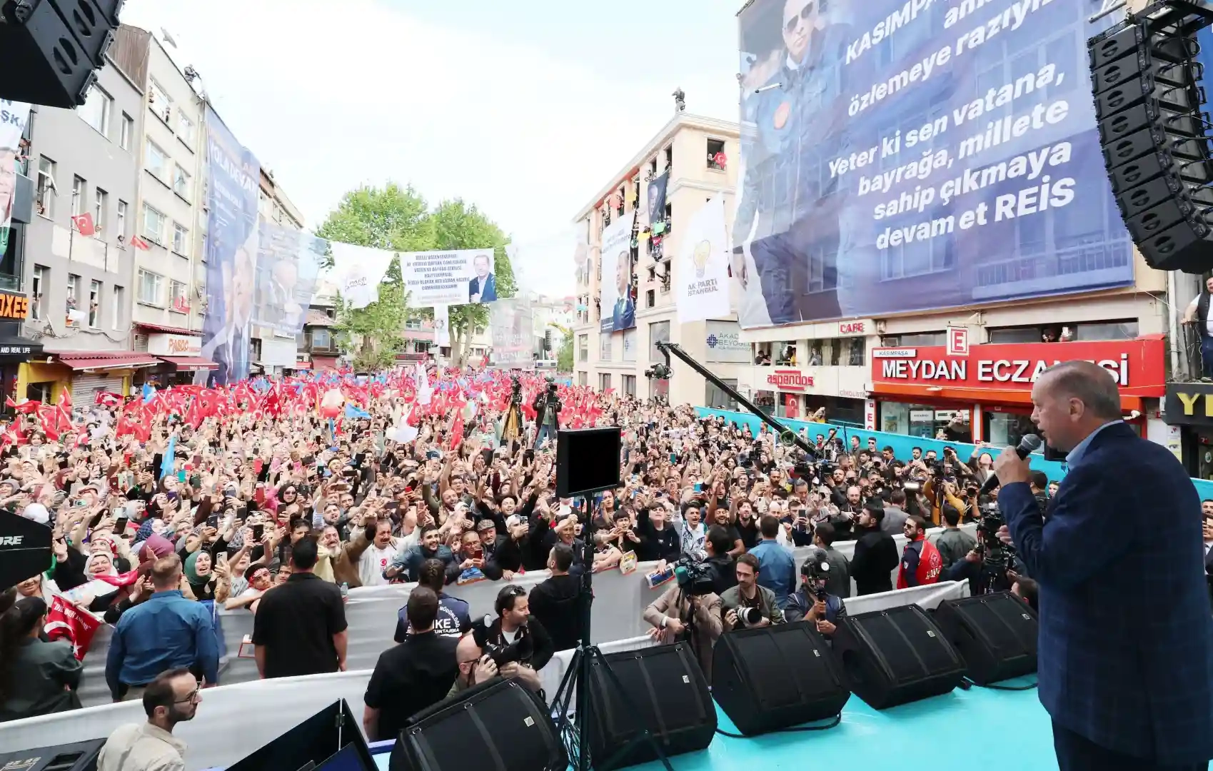 Cumhurbaşkanı Recep Tayyip Erdoğan, Beyoğlu mitinglerinde halka hitap etti. Cumhurbaşkanı Erdoğan, “Buraya gelene kadar yolun sağı solu gümbür gümbür. Resmi rakam şu anda burada 45 bin kişi var. Dik duracağız, dikleşmeyeceğiz, gümbür gümbür sandıklara gideceğiz. 2 gündür İstanbul'un ilçelerinde hemşerilerimizle her biri ayrı ayrı birer destan olan buluşmalar yaptık. Burada doğdum, burada büyüdüm. Son toplantı bu bundan sonra toplantım yok. Bundan sonrası özel. Dün İstanbul’daki maratonumuza Cuma namazında Barbaros Hayrettin Paşa Camii’nin açılışı ile başladık. Levent adı almasının sebebi askerleriydi. Deniz müzesinin olduğu yere doğru inişini yaptı. Preveze Zaferi'nin lideri. Kaptan-ı derya Barbaros Hayrettin Paşa, onun adını verdik. Cami de muhteşem oldu. O çevrede öyle bir cami maalesef yoktu. Onu yapmak da bize nasip oldu. Maliyeti de şu an itibarıyla 750 milyon Türk Lirası” ifadelerini kullandı.