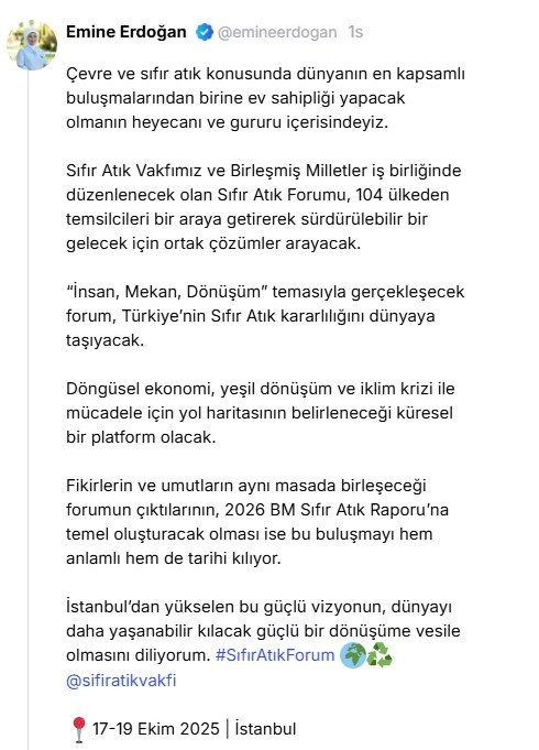 Cumhurbaşkanı Recep Tayyip Erdoğan’ın eşi Emine Erdoğan, 17-19 Ekim’de İstanbul’da düzenlenecek Sıfır Atık Forumu’na ilişkin, "’İnsan, Mekan, Dönüşüm’ temasıyla gerçekleşecek forum, Türkiye’nin Sıfır Atık kararlılığını dünyaya taşıyacak.