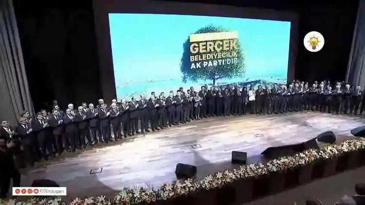 Cumhurbaşkanı Erdoğan'ın konuşması sonrasında sahneye başta Büyükşehir belediyeleri olmak üzere 81 ilin belediye başkan adaylarını çağırarak birliktelik pozu verdi.