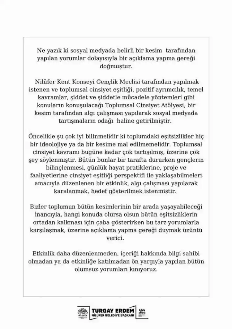 Başkan Erdem imzalı açıklamada, toplumdaki eşitsizliklerin hiç bir ideolojiye yada bir kesime mal edilmemesi gerektiğinin altı çizildi. Toplumsal cinsiyet kavramının bugüne kadar tartışılan bir kavram olduğuna dikkati çekilen açıklamada, "Bütün bunlar bir tarafta dururken gençlerin bilinçlenmesi, günlük hayat pratiklerine, proje ve faaliyetlerine cinsiyet eşitliği perspektifi ile yaklaşabilmeleri amacıyla düzenlenen bir etkinlik, algı çalışması yapılarak karalanmak, hedef gösterilmek istenmiştir. Bizler toplumun bütün kesimlerinin bir arada yaşayabileceği inancıyla hangi konuda olursa olsun tüm eşitsizliklerin ortadan kalkması için çaba gösterirken bu tarz yorumlarla karşılaşmak üzerine açıklama yapma gereği duymak üzüntü vericidir. Etkinliğe katılmadan ön yargıyla yapılan tüm olumsuz yorumları kınıyoruz" ifadeleri yer aldı.