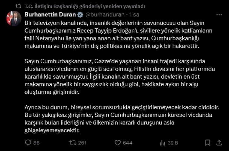İletişim Başkanı Burhanettin Duran, sosyal medya paylaşımında, “Sayın Cumhurbaşkanımız, Gazze’de yaşanan insani trajedi karşısında uluslararası vicdanın en güçlü sesi olmuş, Filistin davasını her platformda kararlılıkla savunmuştur. İlgili kanalın alt bant yazısı, devletin en üst makamına yönelik bir saygısızlık olduğu gibi, hakikate aykırı bir algı oluşturma girişimidir” dedi.