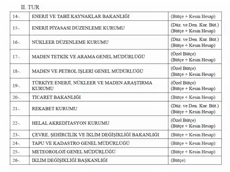 TBMM Meclis Başkanvekili Süreyya Sadi Bilgiç başkanlığında toplanan Genel Kurul programına göre bugün bütçe ve kesin hesapları görüşülecek kamu kurumları şöyle: