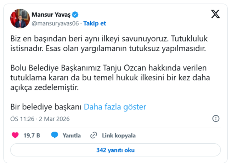 Ankara Büyükşehir Belediye Başkanı Mansur Yavaş, Bolu Belediye Başkanı Tanju Özcan hakkında verilen tutuklama kararına ilişkin sosyal medya hesabından açıklama yaptı.